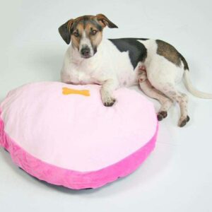 Kuscheliges Kissen in Herzform für kleine Hunde und Katzen. Oberseite aus weichem Samtvelour in Hell und Dunkel-Pink mit eingelegtem Knochen in Orange. Unterseite aus Kunststoff als Nässeschutz.