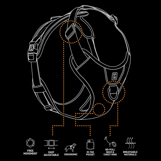 Mit dem EXPLOR Ultimate Fit No-Pull-Geschirr, einem gut durchdachten, ergonomischen Hundegeschirr, das ideal für einen täglichen Stadtspaziergang oder auch ein großes Outdoor-Abenteuer ist, sind Sie unterwegs immer auf Tuchfühlung. Ihr Hund genießt optimale Bewegungsfreiheit, weil der durch Ziehen an der Leine verursachte Druck gleichmäßig über die Brust verteilt wird. So werden lebenswichtige Organe im Nacken geschützt. Das Geschirr verfügt über zwei Befestigungsringe aus Edelstahl: einem auf dem Rücken, der für ruhige oder ältere Hunde geeignet ist, die leicht zu kontrollieren sind und einem verstärkten D-Ring im Brustbereich, um Hunde, die an der Leine ziehen, zu kontrollieren. Das EXPLOR Ultimate Fit No-Pull-Geschirr ist um den Nacken und die Brust herum verstellbar, wodurch es, in Kombinatin mit den stapazierfähigen Materialien, für fast alle Hunde geeignet ist. Die Schnallen sind um die Mitte herum angebracht, so dass der Hund kein(e) Bein(e) anheben muss, wenn das Geschirr angelegt wird. Um das Fell und die Haut des Hundes vor Wundscheuern zu schützen, sind die meisten der Riemen und Schnallen mit weichen, atmungsaktiven Materialien überzogen. Außerdem trocknen die leichten, aber hochwertigen Stoffe, die sowohl für die Innenseite als auch für die Außenseite verwendet werden, schnell, was sehr praktisch ist, wenn Ihr Hund gerne schwimmen geht. Um zu verhindern, dass sich Ihr Hund beim freien Laufen an Ästen verfängt, hat das Geschirr keine Schlaufen oder abstehenden Teile. Das EXPLOR Ultimate Fit berücksichtigt auch die Sicherheit Ihres Hundes im Straßenverkehr. Die reflektierenden Paspeln sind an den richtigen Stellen angebracht und sorgen für optimale Sichtbarkeit im Straßenverkehr. Außerdem gibt es im Brustbereich des Geschirrs eine spezielle Innentasche für einen ID-Anhänger, so dass der Anhänger leicht zugänglich und unbeschädigt bleibt. Rausgehen und ERKUNDEN!