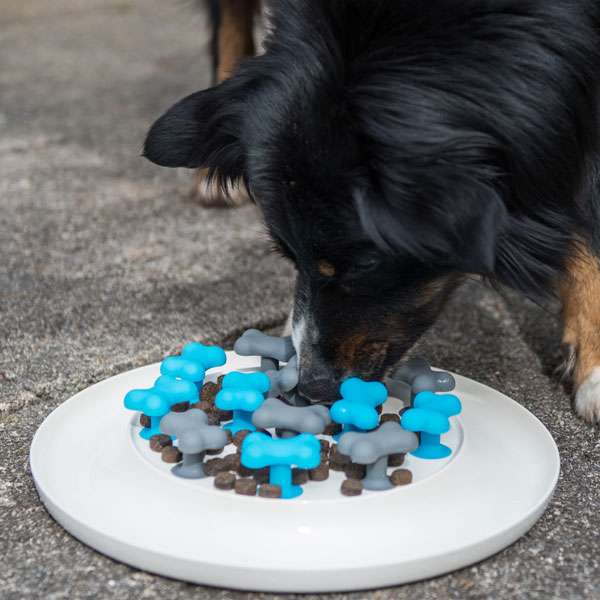 Der Napf hat einen Durchmesser von ca. 35 cm und ist mit beweglichen Knochen aus Silikon bestückt, unter denen sie einfach das Trockenfutter platzieren. Nun darf Ihr Hund sich sein Essen herausfischen, frisst langsam und entspannt und wird gleichzeitig geistig gefördert und trainiert.