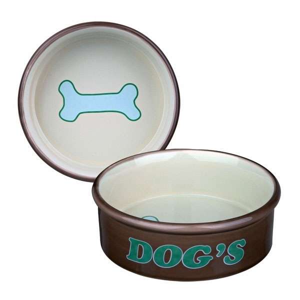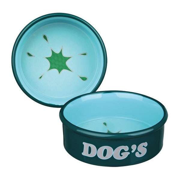 Der Keramiknapf für Wasser ist mit einem Motiv eines Wasserspritzers im Inneren verziert und in modernem petrol/mint gehalten, der Napf für Futter besitzt im Inneren ein Knochenmotiv und ist in der Farbgebung braun/creme. Beide Näpfe sind an der Front mit dem Schriftzug DOGs bestückt.