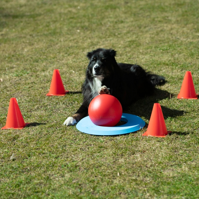 Durch die Pylonen lässt sich der Schwierigkeitsgrad an die Fähigkeiten des Hundes anpassen, indem man einen kleinen Parcours aufstellt, den es zu durchlaufen gilt. So wird das Training nicht langweilig.