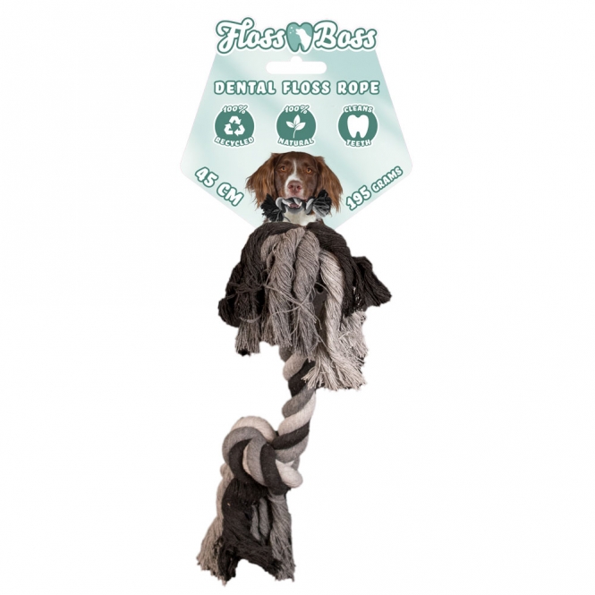 Diese tolle Zahnseil ist aus 100% Baumwolle hergestellt. Es ist sicher, natürlich und langlebig und eignet sich perfekt für Apportier- und Zugspiele. Während des Spiels hilft das Zahnseil, die Zähne des Hundes zu reinigen. Außerdem ist dieses Floss Boss Zahnseil dichter geflochten und viel stärker als normale Zahnseide. Das liegt daran, dass nur ganze Fäden verwendet wurden.
