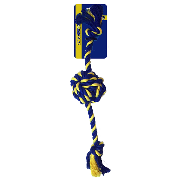 Geflochtenes Seil gefertigt aus starker, „1st class“ Baumwolle. Es gibt viele Seilspielzeuge für Hunde auf dem Markt, jedoch wenige so gut wie dieses! Die blau/gelbe Farbe kann Ihr Hund z. B. auf Rasen besonders gut erkennen.