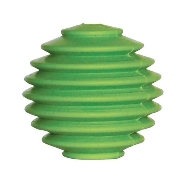 Der Gummiball mit Rillen hat einen Durchmesser von ca. 7 cm und ist innen hohl.