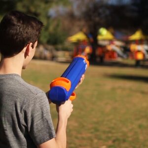 4. Den Tennis Ball Blaster NICHT auf Menschen, Tiere und Gegenstände richten. Eine Hand unter den Lauf und die andere auf den Griff legen. Den Lauf im 45-Grad-Winkel nach oben richten und vorsichtig den Auslöser drücken.
