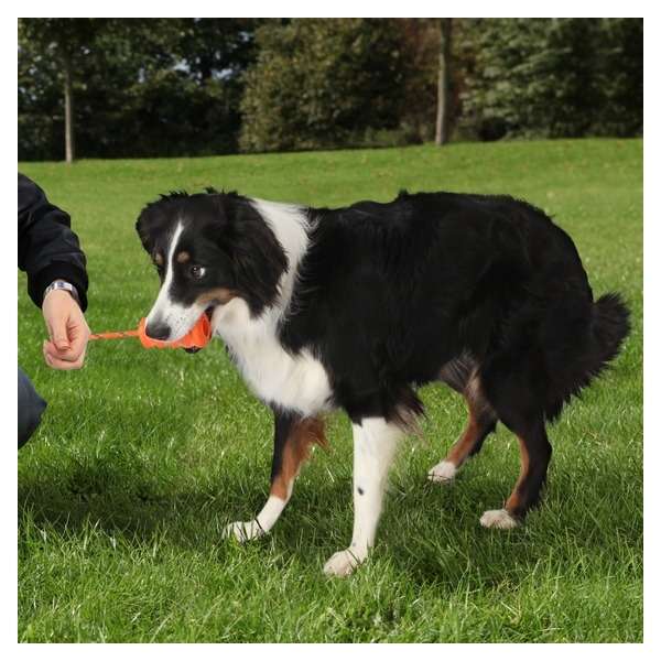 Durch das Band ist er ideal zum Werfen und für Konterzugspiele geeignet. Der Knauf am Ende des Bandes sorgt dabei für ein sicheres und schmerzfreies Halten, auch bei starkem Zug.