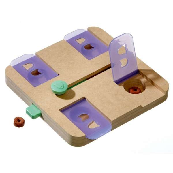 Für Profis! Ein Motivations- und Denkspiel mit verschiedenen Funktionen und Schwierigkeitsgraden. Snacks können in Schubladen versteckt werden, die dann durch Schieben mit der Pfote oder der Schnauze geöffnet werden müssen. Schwieriger wird es, wenn die Schubladen mit Steckpins arretiert werden. Dann können die Schubladen erst geöffnet werden, wenn die Arretierung aufgehoben wurde. Außerdem gibt es noch ein Hütchen mit Duftlöchern als weiteres Versteck. Hygienisch zu reinigen, mit Anti-Rutsch-Stopper.