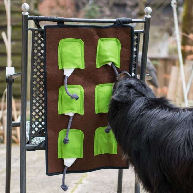 Die Intelligenzschnüffelmatte ist 80 x80cm groß und besteht zur Hälfte aus einer Schnüffelwiese. Die andere Hälfte besteht aus über 20 Leckerli-Versteckmöglichkeiten in sieben verschiedenen Variationen und bietet Ihrem Vierbeiner jede Menge Beschäftigung, Herausforderung und Spaß.
