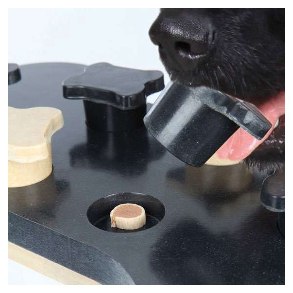 Es entspricht Level 1 für Anfänger. Das Spielbrett hat sechs Vertiefungen, in die Kegel gestellt werden können. Unter den Kegeln werden kleine Leckerlies versteckt. Es gelingt Ihrem Hund mit etwas Übung die Kegel mit der Schnauze anzuheben und sich so seine Belohnung zu erobern.