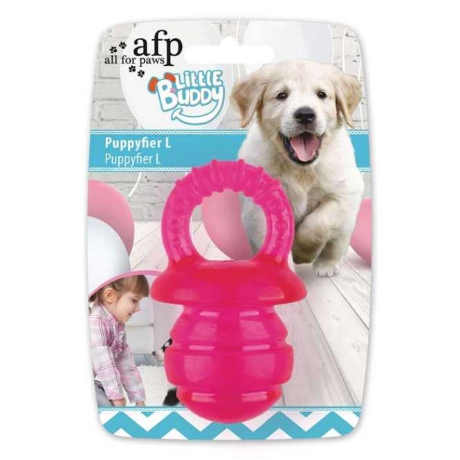 Der Little Buddy Puppyfier ist ein Schnuller, der Ihrem Welpen beim Zahnen unterstützt. Die Rillen und Noppen massieren das juckende Zahnfleisch und den Gaumen und beruhigen es. Das Quietschen des Schnullers animiert immer aufs Neue zum Spielen und Kauen und lenkt die Aufmerksamkeit von anderen Gegenständen ab.