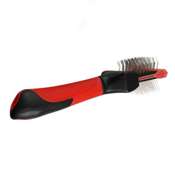 Die Professional Soft-Zupfbürste beidseitig von Karlie Flamingo ist auf der Vorderseite mit geraden und auf der Rückseite mit gebogenen Metallborsten bestückt.