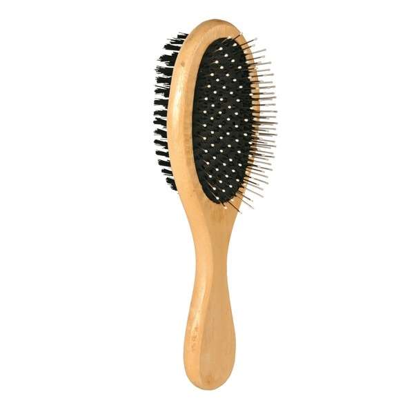 Diese Bürste des Herstellers Trixie dient zur schonenden Pflege des Deckhaars und der Unterwolle. Die Bürste besteht aus Kunststoff. Die Borsten sind ebenfalls aus Kunststoff und haben Noppen. Auf der Rückseite hat diese Bürste Nylonborsten. Für sicheren Halt bei der Fellpflege besteht der Griff aus Gummi.