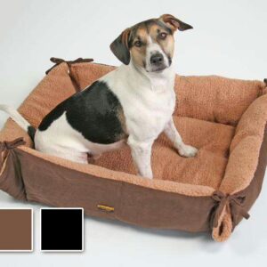 Superbequemes und kuscheliges Hundebett. Außen Velourstoff in Wildlederoptik, innen weicher Teddyplüsch. Wenn man die Schleifen an den Ecken löst, bekommt man eine flache Ruhedecke.