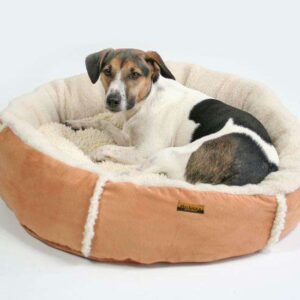 Robustes kuschelweiches Hundebett das Ihrem Vierbeiner gefallen wird. Außen Velourstoff in Wildlederoptik, innen puscheliger Teddyplüsch. Das Innenkissen ist herausnehmbar.