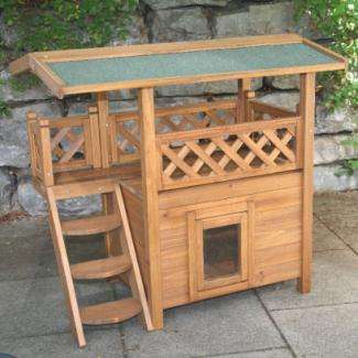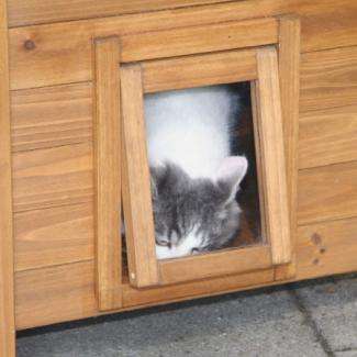 Durch die Schwingtüre mit durchsichtiger Klappe kann sich Ihre Katze an kalten Tagen in einen windgeschützten, geschlossenen Raum zurückziehen und dabei trotzdem noch die Umgebung beobachten. Das Holz ist mit einer Holzschutzfarbe lasiert, um den Wetterbedingungen möglichst gut standzuhalten.