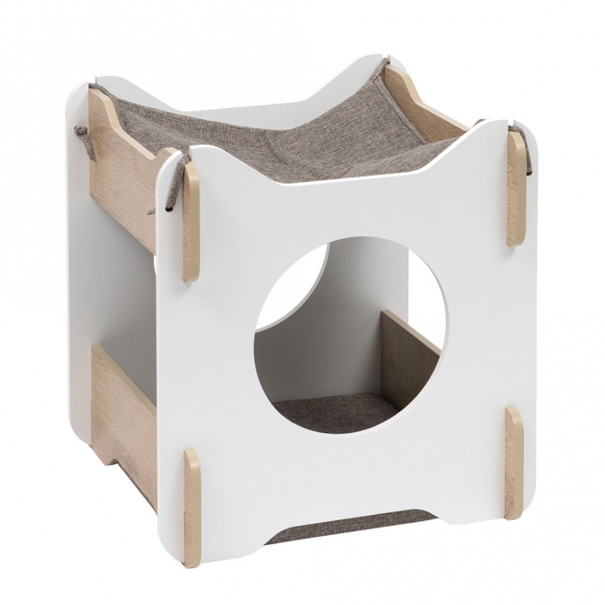 Mit dem Vesper Katzenhaus Cabana bringen Sie einen Blickfang in Ihr Zuhause. Dieses zweifarbige Möbelstück für Katzen verfügt über ein gemütliches Versteck mit weichem, gepolstertem Kissen unten und einer bequemen Hängematte oben.