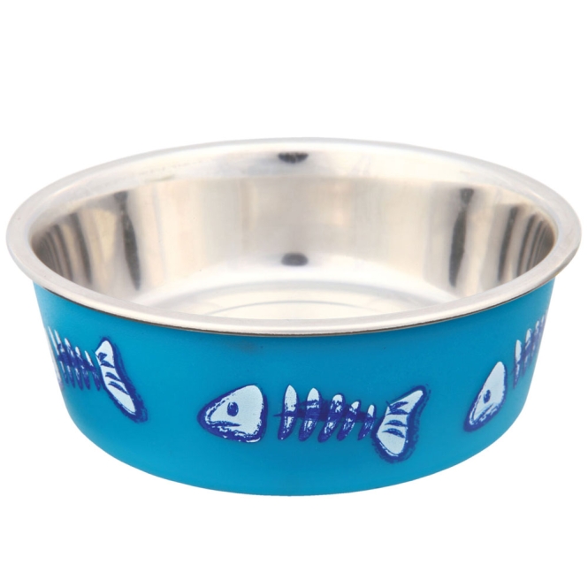 Der Katzennapf aus rostfreiem Edelstahl ist mit einem Kunststoffmantel mit Fischmotiven bestückt. Ein dicker Gummiring an der Unterseite des Napfes macht ihn standsicher und rutschfest.