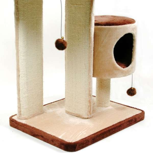 Der Kratzbaum ist mit insgesamt fünf Spielbällen mit Glöckchen an Gummibändern ausgestattet. Da wird sicherlich keiner Katze so schnell langweilig. Es ist zwar unter der Höhle auch ein üblicher Sisalstamm vorhanden, als ideale Kratzgelegenheit bieten sich aber selbstverständlich die beiden Kratzbretter an, auf denen die große Liegeplatte befestigt ist. Bei den Kratzbrettern handelt es sich um stabile Platten, die eine Dicke von über 5 cm haben, teils mit beigem Plüsch bezogen sind und mit Sisal-Kratzflächen mit Maßen von ca. 14 x 55 cm bestückt sind. Ideal also, um dem Kratzinstinkt nach Herzenslust nachzugehen.