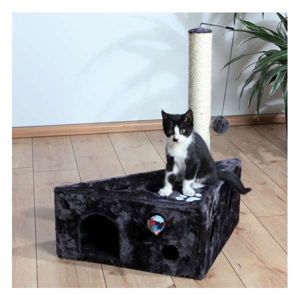 Für die nötigen Schlaf- und Ruheplätze ist aber selbstverständlich auch gesorgt! Die Höhle, die sich ganz unten am Boden befindet, ist komplett mit Fleece ausgestattet und bietet so eine tolle Rückzugsmöglichkeit, die Liegeplatte ganz oben ist mit einem herausnehmbaren weichen Kissen bestückt, welches püer Handwäsche bei 30°C gereinigt werden kann.