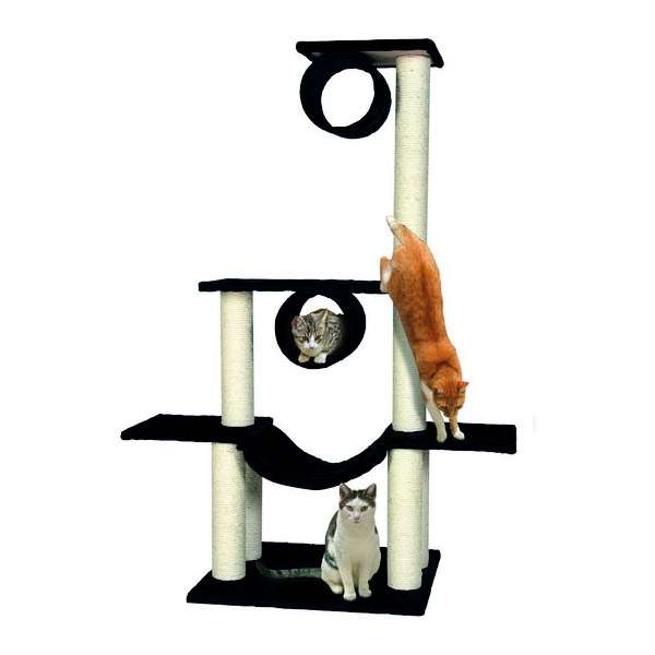 Die Platten und die Höhle sind mit Plüsch bezogen und bieten so bequeme Schlafplätze, während die Sisal-Kratzstämme für eine gute Möglichkeit zum Krallenschärfen sorgen. Die Röhre besteht komplett aus Plüsch.