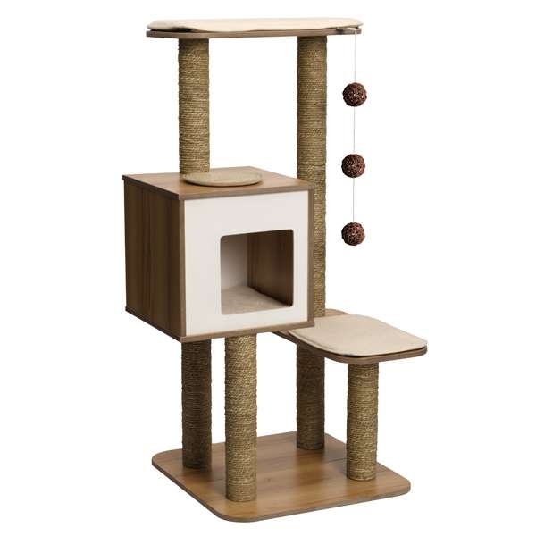 V-High Base besticht durch seine Höhe ist Ausguck und Rückzugsort in einem. Die langen schlanken Seegras-Säulen animieren zum ausgiebigen Kratzen in gestreckter Haltung, die Kubus-Höhle mit Hinterausgang lädt zum Schlummern ein.