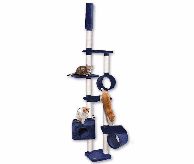 Die Platten und die Höhle sind mit Plüsch bezogen und bieten so bequeme Schlafplätze, während die Sisal-Kratzstämme für eine gute Möglichkeit zum Krallenschärfen sorgen. Die Röhre besteht komplett aus Plüsch. Ein Spielball, der an einem Gummiband am Baum befestigt ist, bereitet Ihrem kleinen Stubentiger Spielvergnügen. Der Deckenspanner, der ebenfalls mit Plüsch bezogen ist, ermöglicht ein Aufstellen des Baumes in Räumen von 235 bis 265 cm Deckenhöhe.