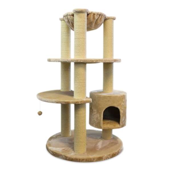 Im unteren Teil des Kratzbaums befindet sich eine Liegefläche mit Spielzeug am Gummiband und eine geräumige Schlafhöhle (40 x 36 cm).