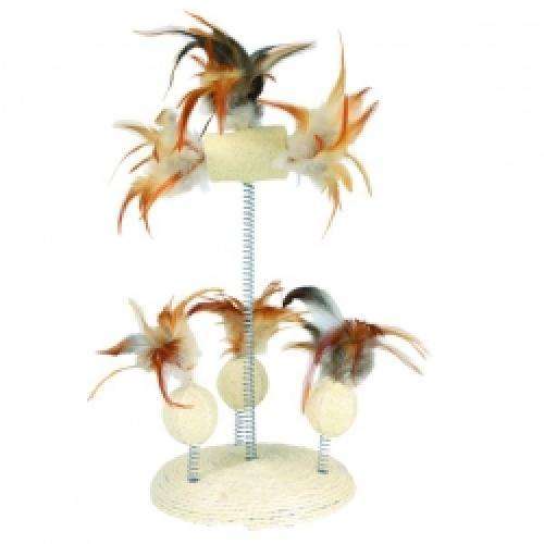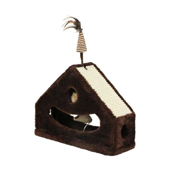 Das Spielzeug ist mit braunem Plüsch bezogen und an einer Seite mit einer Sisalkratzfläche ausgestattet. Im Inneren befinden sich 3 Plüschbälle, sowie eine Sisalmaus, die den Jagdinstinkt wecken, oben befindet sich ein zusätzliches Sisalspielzeug mit Federn.