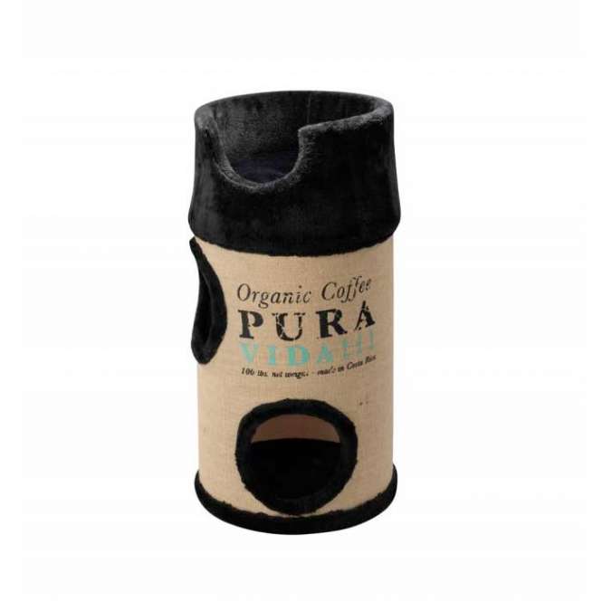 Diese Kratztonne ist komplett mit robustem Jute-Stoff verklebt. Sie ist mit zwei Höhleneingängen, zwei mit Plüsch besetzten Ebenen und einem gepolsterten Bett auf der Oberseite der Tonne ausgestattet.