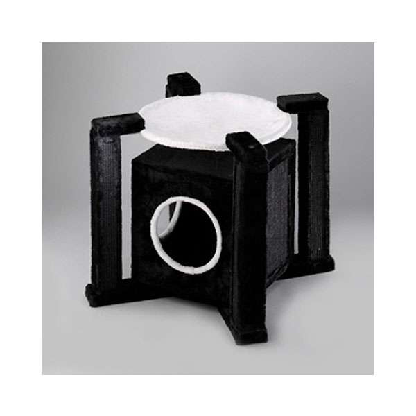 Der Kratzbaum mit besonders schwerer Qualität besteht aus einer viereckigen Höhle mit zwei getrennten Etagen, die durch weiß eingefasste Eingänge an verschiedenen Seiten der Tonne zu erreichen sind. An einer der anderen beiden Seiten befindet sich eine Sisal-Kratzfläche, die wie die Höhle selbst in schwarz gehalten ist. Auch die quadratischen Stämme sind an einigen Seiten mit Sisal-Flächen bestückt, so ist ausreichend Platz zum Krallenschärfen für Ihre Samtpfote vorhanden.
