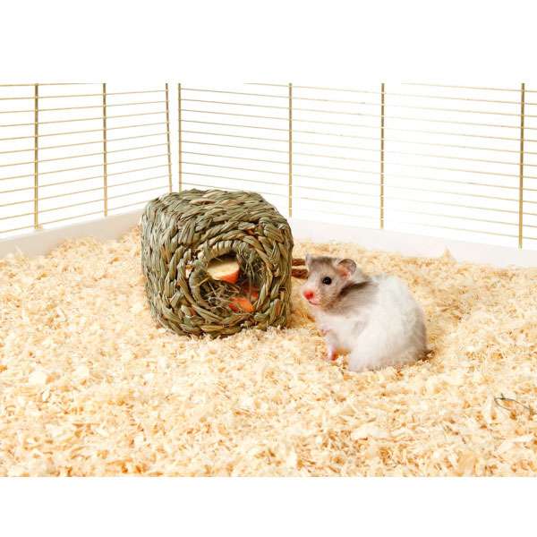 Dieses ovale Grasnest eignet sich ideal als Schlafhaus oder als Spielzeug zum Befüllen mit Heu, Kräutern oder anderen Snacks. Das Nest ist mit einem Seil und einem Haken aus Holz versehen, so dass es entweder ins Käfiggitter eingehangen oder einfach auf den Käfigboden gelegt werden kann. Das Grasnest ist 100 % natürlich und verdaulich.