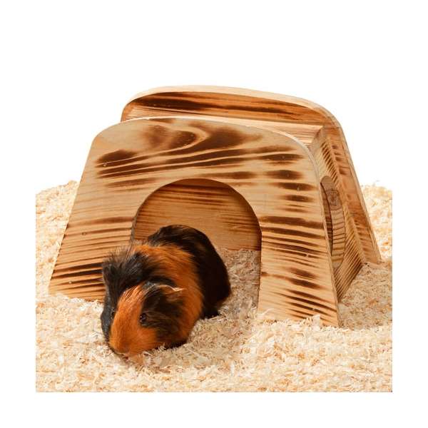 Fertig montiertes Spiel- und Schlafhaus aus geflammtem Echtholz zum Spielen, sich Zurückziehen und Ausruhen. Die Öffnungen sorgen für eine natürliche Luftzirkulation.