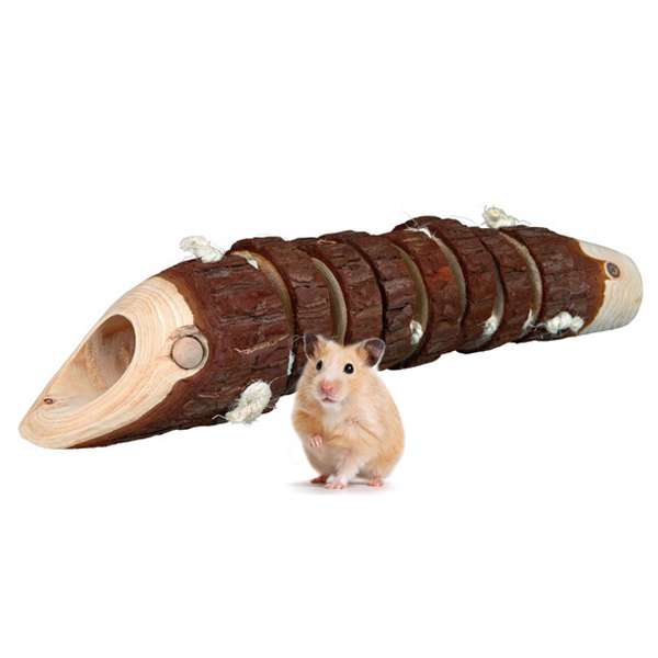 Mit einer Holzleiter, einer Hängematte mit Nylon-/Lammfell-Optik (Polyester), einer Strickleiter und einem Tauring mit Holzklotz bleiben keine Nagerwünsche unerfüllt.