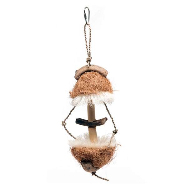Spielspaß und lange Beschäftigung verspricht dieses natürliche Vogelspielzeug, das unter anderem mit Kokosfasern und Holz bestückt ist.