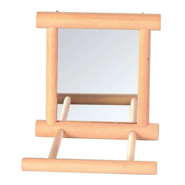 Beschäftigung für kleine Vogelarten bietet dieser Landespiegel mit Holzrahmen zum Einhängen ins Käfiggitter. Mit Sitzstange.