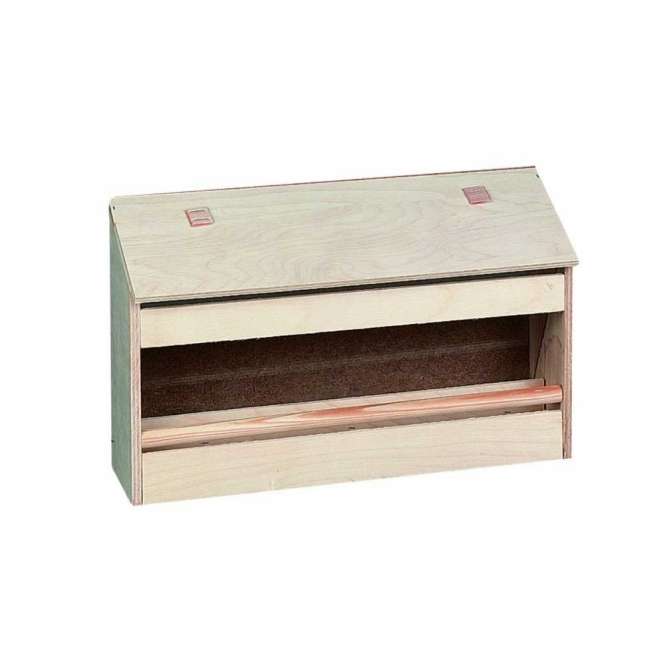 Diese Futterkrippe ist aus Holz gefertigt und verfügt über eine integrierte Sitzstange. Das Dach verhindert, dass das Futter im Regen nass wird.