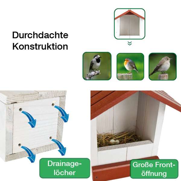 Der Nistkasten verfügt über eine große Frontöffnung.