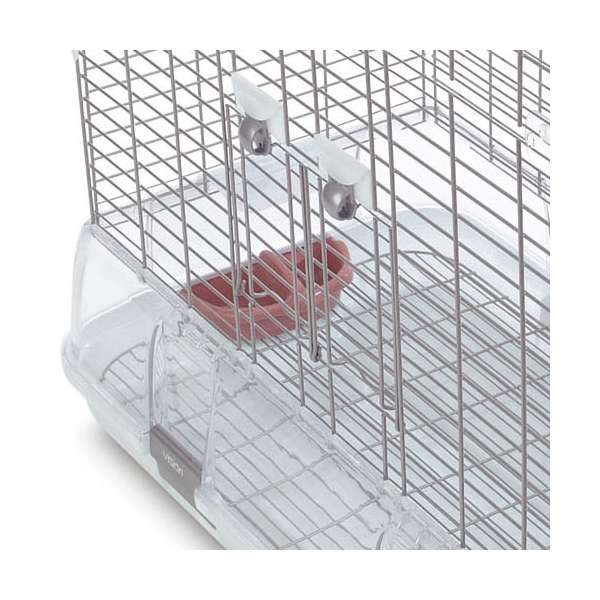 – Von außen zugängliche Futter- und Wassernäpfe und Vogelsitzstangen